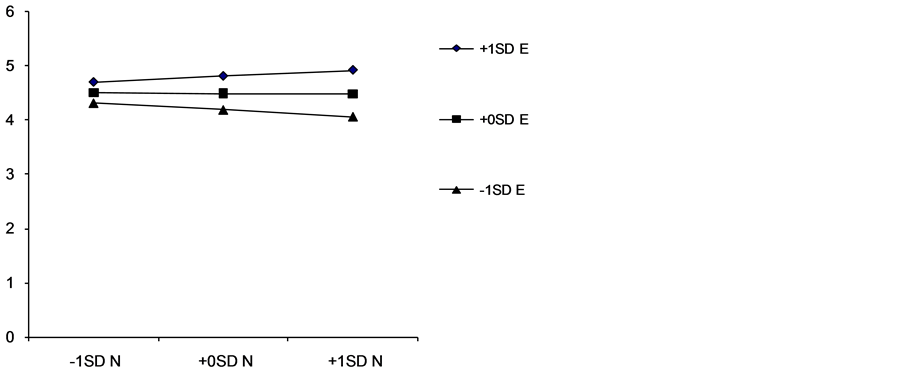 As shown in Figure 1, those who were high in Extraversion and high in Neuroticism (impulsive and complicated types) tended to have more friends than those high in Neuroticism but low in Extraversion. This was consistent with expectations for the impulsive type. However, a simple slope analyses did not reveal a significant result.