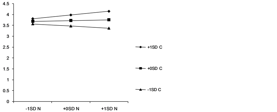 Figure 2. Plot of the two-way interaction between Neuroticism and Conscientiousness for number of Facebook friends for non-students. N = Neuroticism, C = Conscientiousness.
