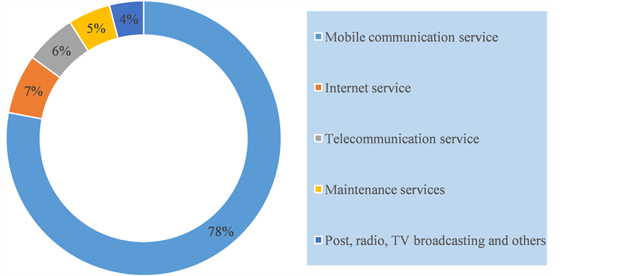 Figure 2. The total revenue and service types of ICT sector, by percentages source: white paper on ICT development, Mongolia-2013.