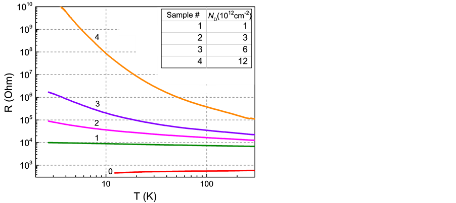 Let’s discuss now samples 2 - 4 with pronounced insulating behavior. Plotting the data on the Arrhenius scale lnR vs. 1/T shows that energy of activation continuously decreases with decreasing T which is characteristic for the variable-range-hopping (VRH) conductivity [25] . There are two kinds of VRH depending on the structure of the density-of-states (DOS)