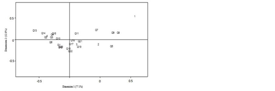 Figure 1 shows the correspondence for the 22 questions contained in the questionnaire. Questions 5, 7, 8 and 9 were found to be associated with the response levels 1 and 2, indicating aspects that require greater investigation and appropriate interventions. The remaining questions were associated with responses 3 and 4, which indicate a positive perception on the part of the persons interviewed regarding the services provided.