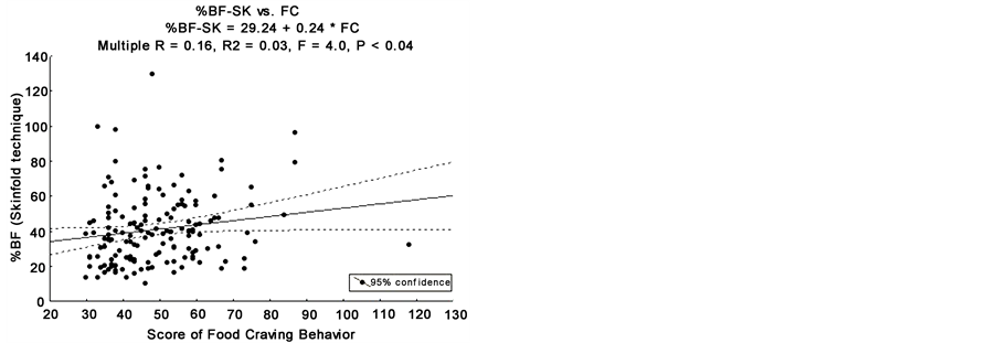 Figure 4. Shows a positive relationship between the body fat mass (percentage of body fat by skinfold technique) with the score of food craving behavior (FCB). Demonstrated that women with higher body fat have higher scores of FCB.