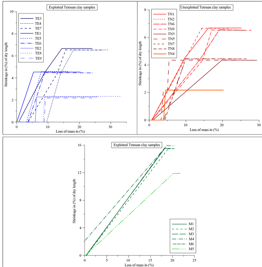 similar (Figure 4), although there were some small differences in shrinkage, ranging from 12% to 17%, accom- panied by a loss of weight from 19% to 22%. Tetouan clay samples showed a low drying shrinkage (2% - 6%), in contrast to the Meknes clay samples. Tetouan clays showed a greater increase of the loss on weight (20% - 23%). The highest linear shrinkage of Meknes clays can be explained by its smectite content and its high PI value [34] . Consequently Meknes clays have more problematic drying behaviour. By contrast, Tetouan (TN and TE clays) showed a low drying shrinkage, and they have more suitable behaviour.