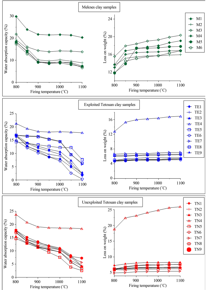 The results for linear firing shrinkage, loss on mass and water absorption of the fired clays are displayed in Table 3 and Figure 5, respectively. Linear firing shrinkage and water absorption have been frequently used as quality and process control parameters in the development and manufacturing stages of the production of struc- tural ceramics such as floor and wall tiles [35] [36] . The linear firing shrinkage could be used as a direct meas- ure of the extent of densification [37] . The linear firing shrinkage increased gradually from 1000˚C to 1110˚C for most of the Tetouan clays (TN and TE). This evolution reflects densification of the fired clays. As an excep- tion, some fired clays (TE5, TE7 and TE8) do not show any shrinkage. At 800˚C, Meknes clays shrank from 17% to 29% and their shrinkage increased again gradually from 850˚C to 1110˚C. Meknes clays are characterized by an early densification from 800˚C. This is due to the formation of a glassy phase, because they contain large amounts of fluxing agents (Na2O, K2O and MgO) (Table 2). Loss on weight stability is indicated from 1000˚C for most of the sintered clay bodies (Table 3). It can be seen that an increase in the shrinkage with a decrease in water absorption are associated with an increase in firing temperature. This trend is found especially above 1000˚C. Shrinkage is related to the formation of high temperature crystalline phases, and the rates of shrinkage