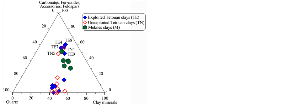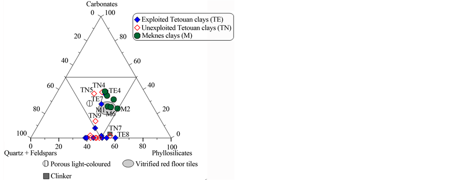 chemistry and physical properties of the material. These factors will determine the behaviour of the clay during forming, drying and firing with direct influence on the final product [39] . In order to evaluate the suitability of the studied clays for different ceramic products, a ternary diagram from [40] based on XRD results [19] is shown in Figure 6(a). Two groups can be identified: those with high quartz contents and those that are rich in oxides, carbonates and feldspars. The mineralogical data for the samples (Figure 6(b)) also suggest that most of the Meknes clays can be used for vitrified red floor tile making. However Tetouan clays can be used for differ- ent ceramic applications due to their high quartz amount and their low amount of iron oxide. TN7 and TE9 may be used for making clinker products and TE7 for vitrified red floor tiles (Figure 6(c)). Some Tetouan samples (TN5, TN9 and TE7) are located close to the porous light-coloured field; they can therefore be used for porous light-coloured wall tile product.