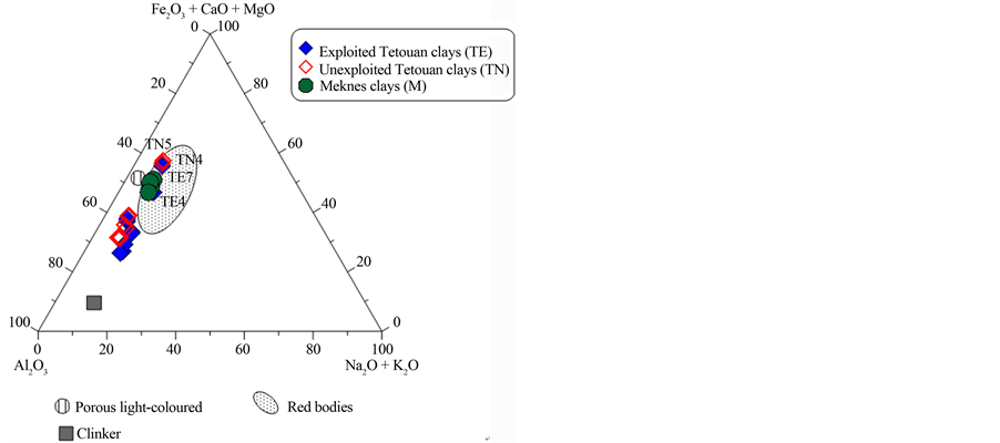 materials and industrial ceramic bodies [40] . All Meknes clays plot in the field of red ceramics, close to the field for porous light-coloured ceramics. Most of the Tetouan clays were located outside of the red ceramics field, with the exception of TE4, TE7, TN4 and TN5, which are close to the field for porous light-coloured ceramics. The ideal composition for an optimum white body product (SiO2 = 72 wt%, Al2O3 and total oxides = 8 wt%)