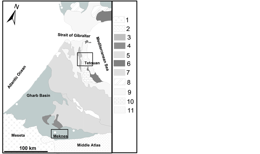 Figure 1. Structural sketch map of the northern occidental part of the Rif Chain and the Northern central of Morocco (modified after [45] ). 1―Foreland basement, 2―Meseta and Atlas cover series; 3―Foredeep basins; 4―Detached Atlasic cover at Prerif front; 5―Prerif; 6―Alpujarrides-Sebtide nappes; 7―Intrarif, Mesorif, Rif nappes; 8―Sud-Betic Zone; 9―Mag- hrebian Flyschs; 10―Dorsale calcaire units, 11―Malaguide- Ghomaride nappes.
