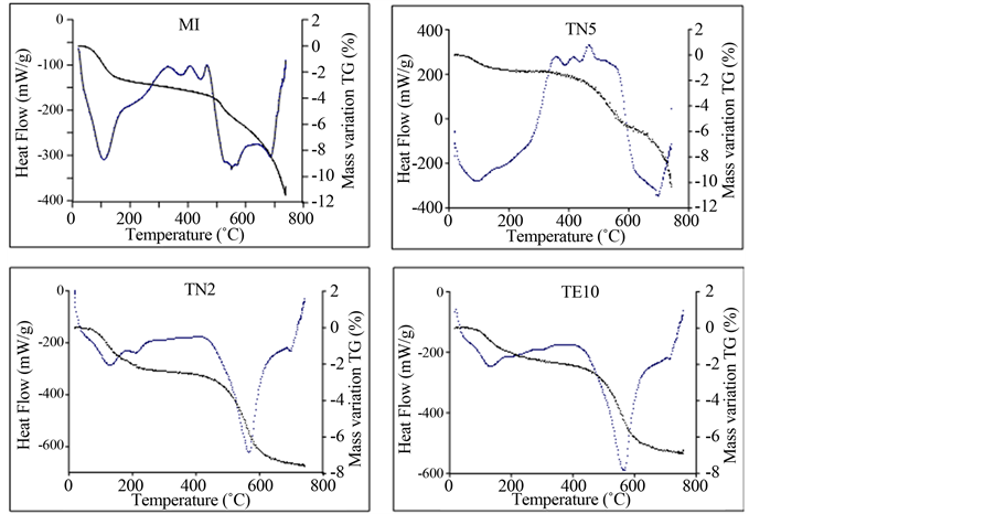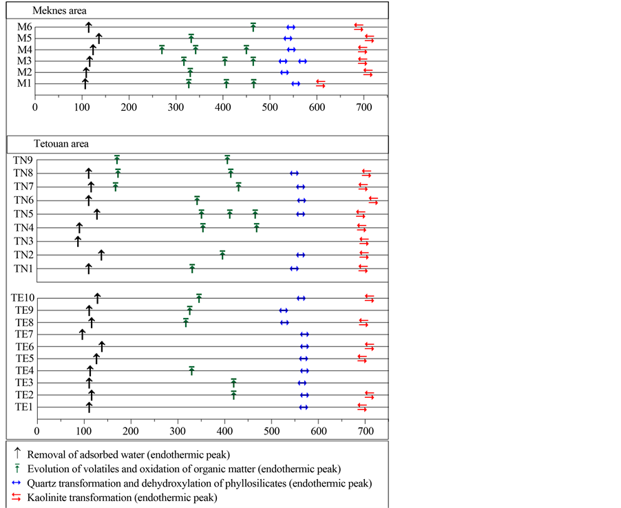 The DSC/TG (Figure 3(a) and Figure 3(b)) show at least 4 peaks. The first endothermic peak is observed at 90˚C - 150˚C for Tetouan samples and between 96˚C and 113˚C for Meknes samples. Such peaks can be attrib- uted to the removal of adsorbed and interlayered water. The associated mass lost ranges from 0.4% to 0.8% for Meknes clays and between 0.4% and 1.3% for Tetouan clays. A large exothermic peak is observed between 200˚C - 450˚C. Due to organic matter decomposition [31] , it was observed in all studied clays, but was espe- cially well marked at 450˚C for M6. A broad endothermic band, sintered at 520˚C to 550˚C for Meknes samples