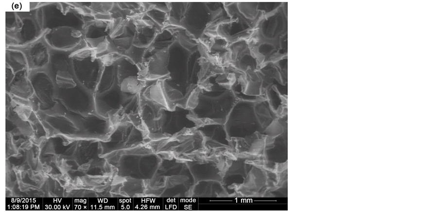 Figure 5. SEM micrographs for PUF-1# (a), PUF-2# (b), PUF-3# (c), PUF-4# (d) and PUF-5 (e) showing the effect of increasing tin catalyst on the cellular structure of polyurethane foam.
