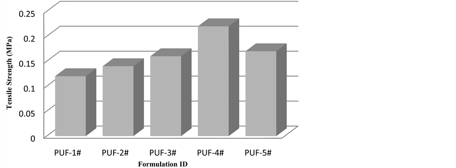 microscope as shown in Figure 5 (PUF-1# (A), PUF-2# (B), PUF-3# (C), PUF-4# (D) and PUF-5(E)) which cause increase in the tensile strength values until reach to optimum ratio (Maximum tensile strength) at PUF#4 according to Figure 6.