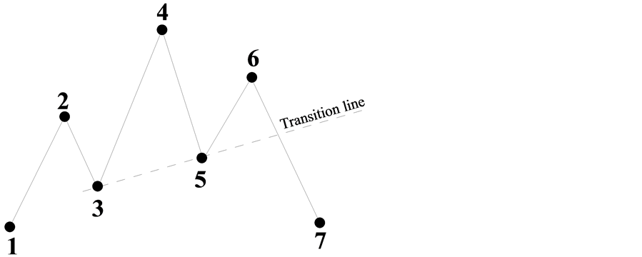 In microsequence TT-7S (Figure 1), we identify a peculiar trend, which involves the magnitude values fluctuations that is completed during the energy release phase: it develops a first maximum (point 2) followed by a minimum value (point 3). Hereinafter, the magnitude values begin to rise again (point 4) reaching higher values than the previous maximum, and a second minimum (point 5), which generally has greater value compared to the previous one. The next step is characterized by a third peak (point 6) lower than the second maximum, followed by the last minimum (point 7) that is placed below the “transition line” [6] joining the minimum points 3 and 5, respectively. This completes the microsequence TT-7S [7] .