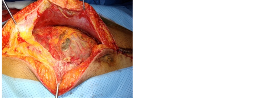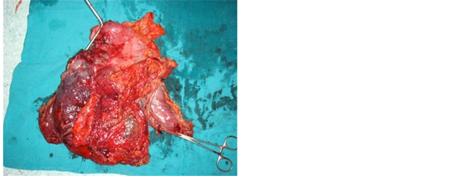 The patient underwent surgery (Figure 5) a month later, which revealed a cystic tumor of 30 cm in diameter, displacing the stomach back and left with an intimate contact with the underside of the left lobe of the liver. A total gastrectomy was performed, with hepatic resection of the left lobe of the liver, allowing removing quite the