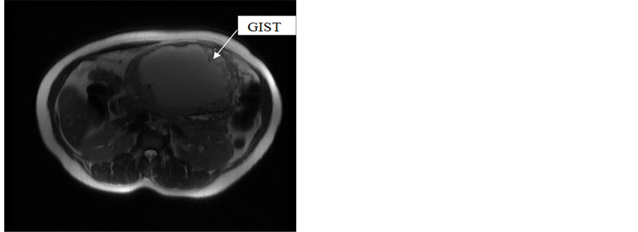 GISTs are usually well-circumscribed without encapsulation, they grow preferentially on the serosal side of the bowel wall. Macroscopically, the measurement of the maximum diameter of the primary tumor is an important parameter for evaluating the evolutionary potential [7] . It is important to sample the tumor, for the differential diagnosis with other sarcomas (e.g. liposarcoma), and because there may be variations in the proliferation index. Histoloically, cell density is generally high and homogeneous, and necrotic alterations, edema and/or bleeding are as most frequent as tumors are large. The cells are fusiform in 70% of cases, most often with a fascicular architecture, suggesting a smooth muscle proliferation. Several other tumors may express c-KIT [8] in the majority (seminoma, adenoid cystic carcinoma) or in a variable proportion of cases (melanoma, lung carcinoma, etc…). Approximately 5% of GISTs are negative for c-KIT and then the diagnosis requires the identification of mutations of KIT or PDGFRA genes in tumor DNA [6] . The average diameter of symptomatic tumors is 6 cm against 1.5 cm for asymptomatic tumors [9] . Our patient had a tumor exceeding 20 cm. The cases reported in the literature had tumors diameter ranging between 4 and 17 cm [10] . Useful tests for the diagnosis of GIST depend on the size and location of the tumor. For tumors less than 5 cm and gastric or colorectal localization, the diagnosis is made by endoscopy and confirmed by ultrasonography. For small GIST of the small intestine, the diagnosis is made by enteroclysis and/or enteroscopy. In the case of very large GIST, abdominal CT remains the gold standard is the abdominal CT [11] or MRI in pregnancy, which was perfomed in our case.