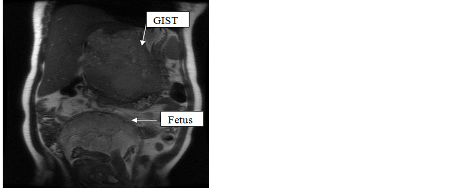 Gastrointestinal stromal tumors (GIST) are rare tumors. the incidence is aproximately 10 to 20 cases per million people and year [1] . Early diagnosis is important for preserving the prognosis. They are much rarer during pre- gnancy, few cases have been reported in the literature [2] . GISTs are indeed the most common mesenchymal tumors of the gastrointestinal tract. Microscopy and immunohistochemistry allowed classifying these tumors according to their phenotypes and prognosis. The two main markers identified were CD34, and KIT protein or CD 117.