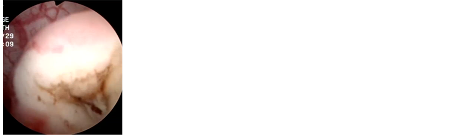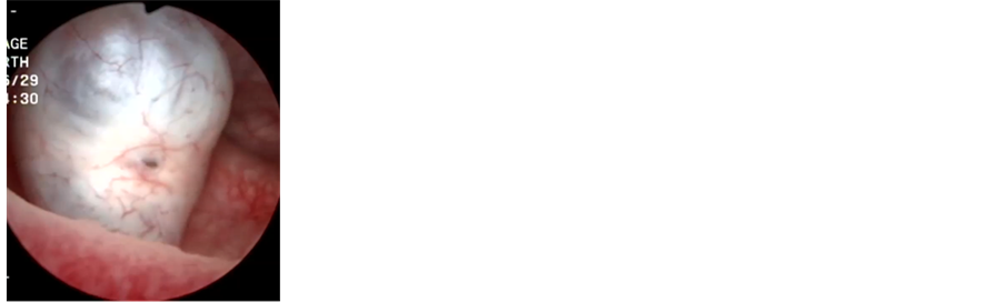 Figure 4. Intraoperative finding in 2015 showing the right ureterocele on the ureter orifice, expansion of the right ureterocele at the time of urine discharge (a), incision of the ureterocele (b), and the ureterocele after incision (c).