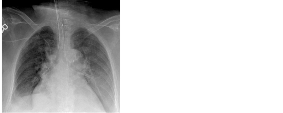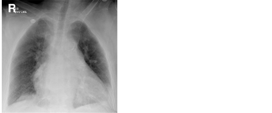 Vertebroplasty was done under local anesthesia using Acrylic Cement. The procedure was prolonged but uneventful. Upon presentation the patient denied any cough or sputum production. She did have chills and body aches. On admission, Temperature was 100.1 F. with Respiratory rate of 28 breaths per minute. On examination, she was found to have coarse breath sounds with normal cardiac vascular exam. The site of Ver- tebroplasty was intact and dry. Oxygen Saturation was 91% on 2 liter per Minute Nasal cannula. Chest x-ray upon admission was with no significant pathology (Figure 1).