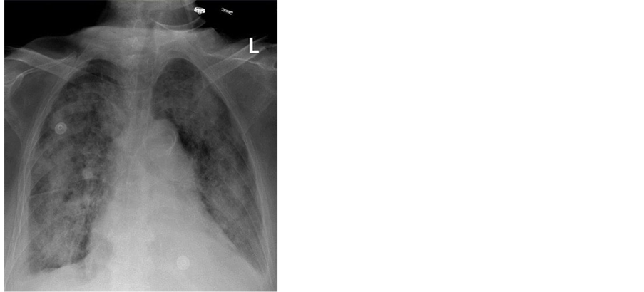 Two days after admission; diffuse alveolar infiltrates developed (Figure 2). Patient was transferred to the Intensive Care Unit (ICU) and placed on mechanical ventilator support. Patient was treated as a case of adult respiratory distress syndrome (ARDS). Trans echocardiography was done and revealed no abnormalities.