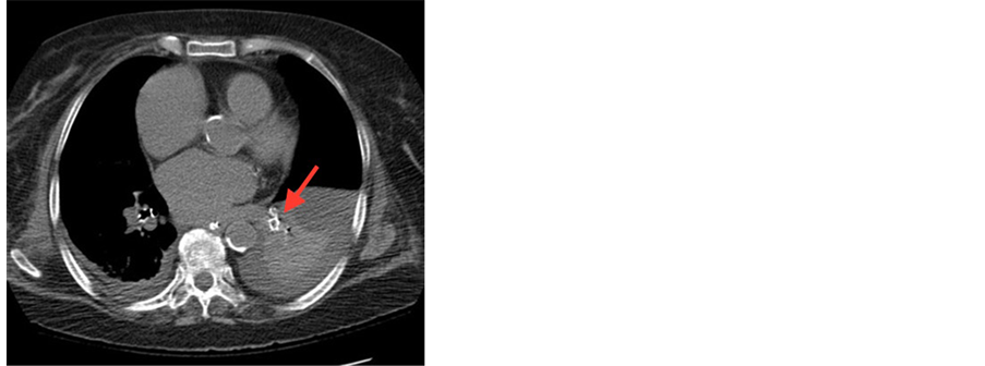 Figure 3. CT chest without contrast. Grains of Cement in the pulmonary parenchyma at the left lower lobe. See red arrow.