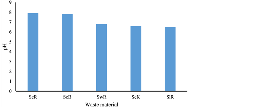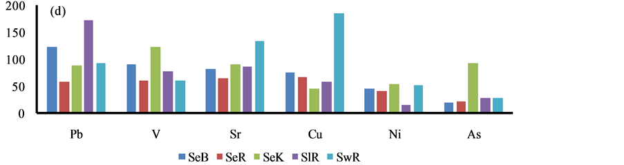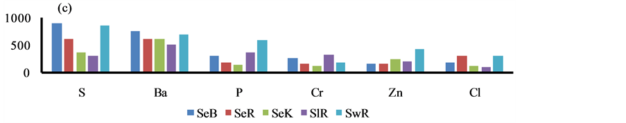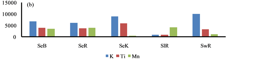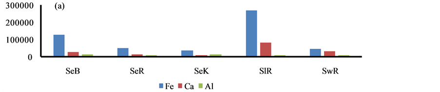 The color of sediments was varied from reddish (R) to black (B) due to deposition of the BC, metal oxides and organic resides. The pH value of the extract (n = 20) was ranged from 6.2 - 8.2 with mean value of 7.4 ± 0.3. The lower pH values of the SeK, SlR and SwR was observed due to presence of higher content of chlorine and sulfur, Figure 2.