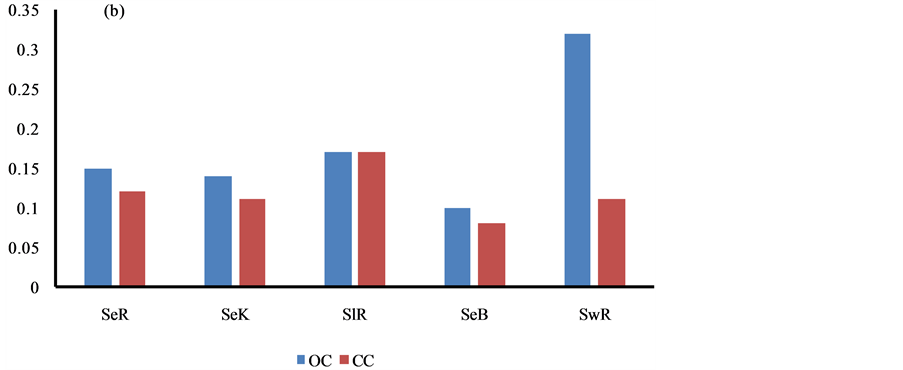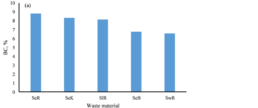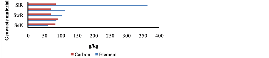 The carbon content of the geowaste materials is presented in Table 1. The concentration of BC, OC and CC was ranged from 4.87 - 9.62, 0.07 - 0.32 and 0.05% - 0.17% with mean value of 8.12 ± 0.57, 0.15 ± 0.02 and 0.11% ± 0.01%, respectively. They were found to correlate well (r = 0.72), indicating origin from the similar sources i.e. burning processes. The comparable content of the BC and CC in all types of waste materials were marked, Figure 3. The significantly higher content of OC in the sewage was seen due to input by the organic waste, Figure 3. The BC content in the sediment of the studied area was observed to be higher than in of other regions, probably due to huge coal burning in this region [34] - [36] .