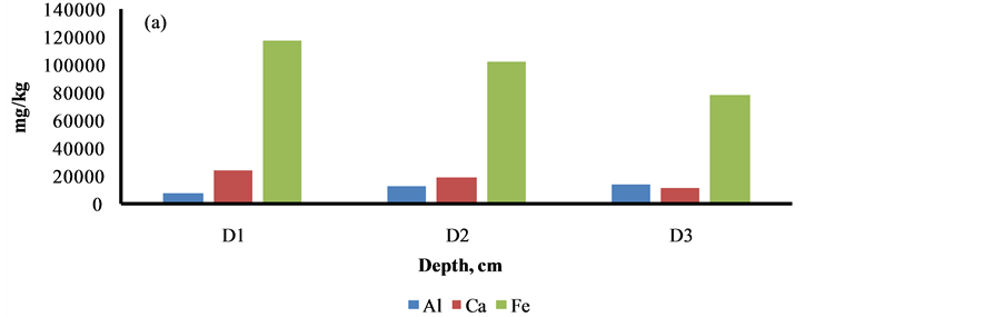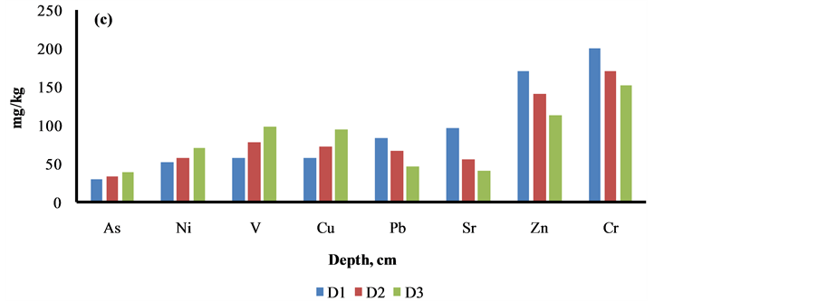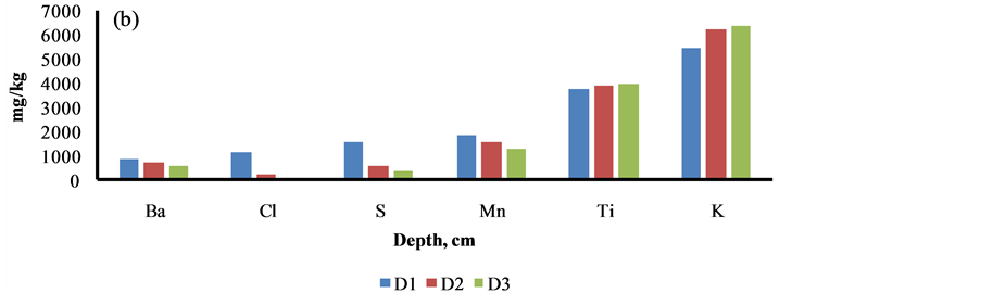 The content of elements i.e. Al, As, Ni, Cu, V, Ti and K was increased as the depth profile of the sediment was increased from 0 to 30 cm, may be due to their less binding with the organic materials, Figure 5. The reverse trend was marked with other elements i.e. Cl, S, Ca, Ba, Sr, Cr, Mn, Fe, Zn and Pb, may be due to higher adsorption with the organic materials, Figure 5.