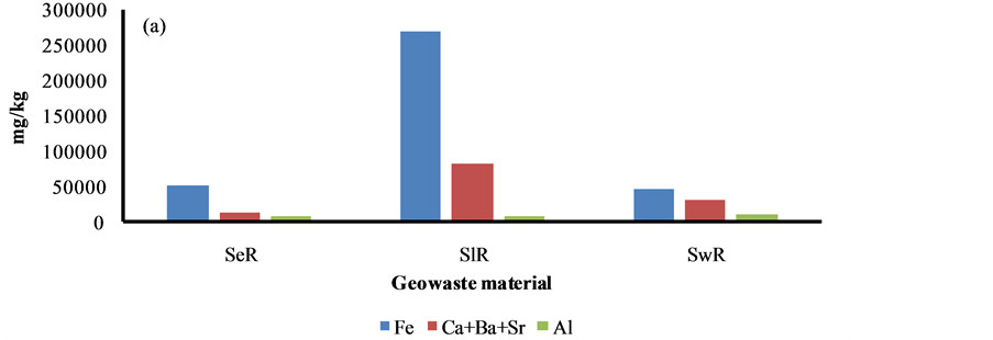 The elevated concentration of metals i.e. Al, K, Ca, Ti, Fe and Mn in the geowaste materials was observed, ranging (n = 20) from 4864 - 18806, 593 - 11179, 579 - 72184, 2135 - 8121, 9737 - 319848 and 127 - 25614 mg/kg with mean value of 11088 ± 1851, 6874 ± 1304, 18268 ± 9468, 4116 ± 671, 73262 ± 34589 and 2782 ± 2484 mg/kg, respectively, Table 2. Among them, the highest Fe content was observed in all geowaste materials due to roasting of iron ores and huge coal burning in the studied areas. The concentration of P, S, Cl, As, Sr, Ba, V, Cr, Ni, Cu, Zn and Pb was marked in the sediments at traces, ranging from 95 - 584, 91 - 1822, 31 - 1117, 12 - 105, 40 - 135, 478 - 1078, 35 - 175, 88 - 392, 14 - 77, 32 - 185, 38 - 626 and 18 - 228 mg/kg with mean value of 232 ± 63, 604 ± 240, 231 ± 119, 39 ± 14, 79 ± 12, 644 ± 78, 83 ± 15, 182 ± 41, 44 ± 7, 68 ± 18, 199 ± 71 and 85 ± 25 mg/kg, respectively, Table 2.