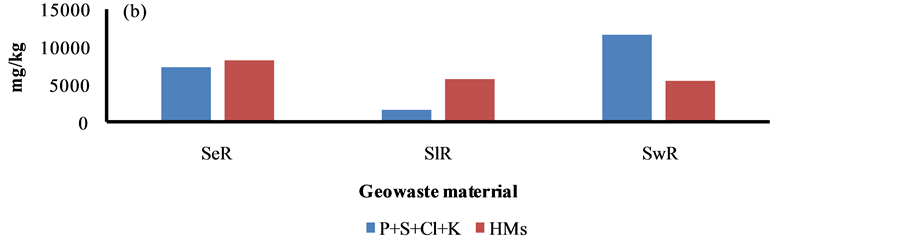 Figure 6. Sludge is a solid waste material produced by the iron and thermal power plants in the studied area. Sewage is also a solid waste contributed by domestic households, industrial and agricultural wastes. The highest content of Fe and Ca was marked in the sludge waste. The sewage waste was found to be very rich (1.2%) in nutrient (i.e. P + K + Cl + S) levels. However, the higher content of HMs (i.e. As + Ti + V + Cr + Mn + Ni + Cu + Zn + Pb) was seen in the sediment. The concentration of HMs i.e. Fe, Mn, As and Pb in the sediment of the study area was found to be higher than sediments of other regions due to a huge mineral and coal roasting [11] - [30] .