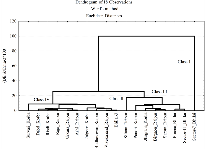 Cluster analysis was performed on the dataset by Ward’s method using Euclidean distance as similarity measure. The variables were interrelated to each other according their maximum similarities. First, the interrelation takes place between two variables which have the most similarity and the next repetition other similar pair clusters were related together. Four clusters or class of sample sites were identified with distinct cluster centers (Figure 8).