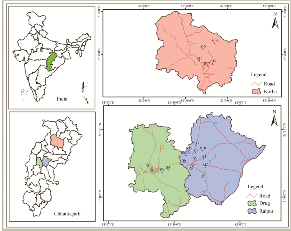 Three most industrial cities of Chhattisgarh state namely: Raipur (21˚23'N, 81˚63'E), Bhilai (21˚18'N, 81˚28'E) and Korba (22˚21'N, 82˚40'E) were selected for the proposed investigation. Raipur is the capital city of the Chhattisgarh state, India with population of ≈2.0 million. The Raipur city and its neighborhood are now becoming an important regional commercial and industrial destination for the coal, power, steel and aluminum industries. Raipur is one of biggest iron and cement market in the country. Bhilai is the second-largest city inclusive of Durg city in Chhattisgarh with population of »1 million, and is located in the west of Raipur ≈ 22 km away. The town is famous for the operation of one of the largest steel plant in the World (capacity: 3.15 MT/Yr). Korba is another city in Chhattisgarh with ≈0.5 million population, famous for power supply and aluminum plant.