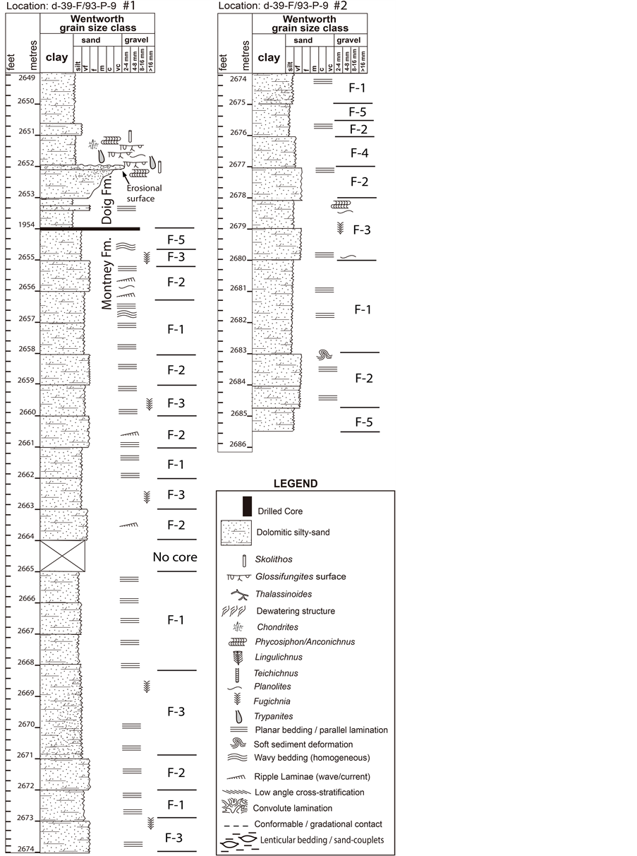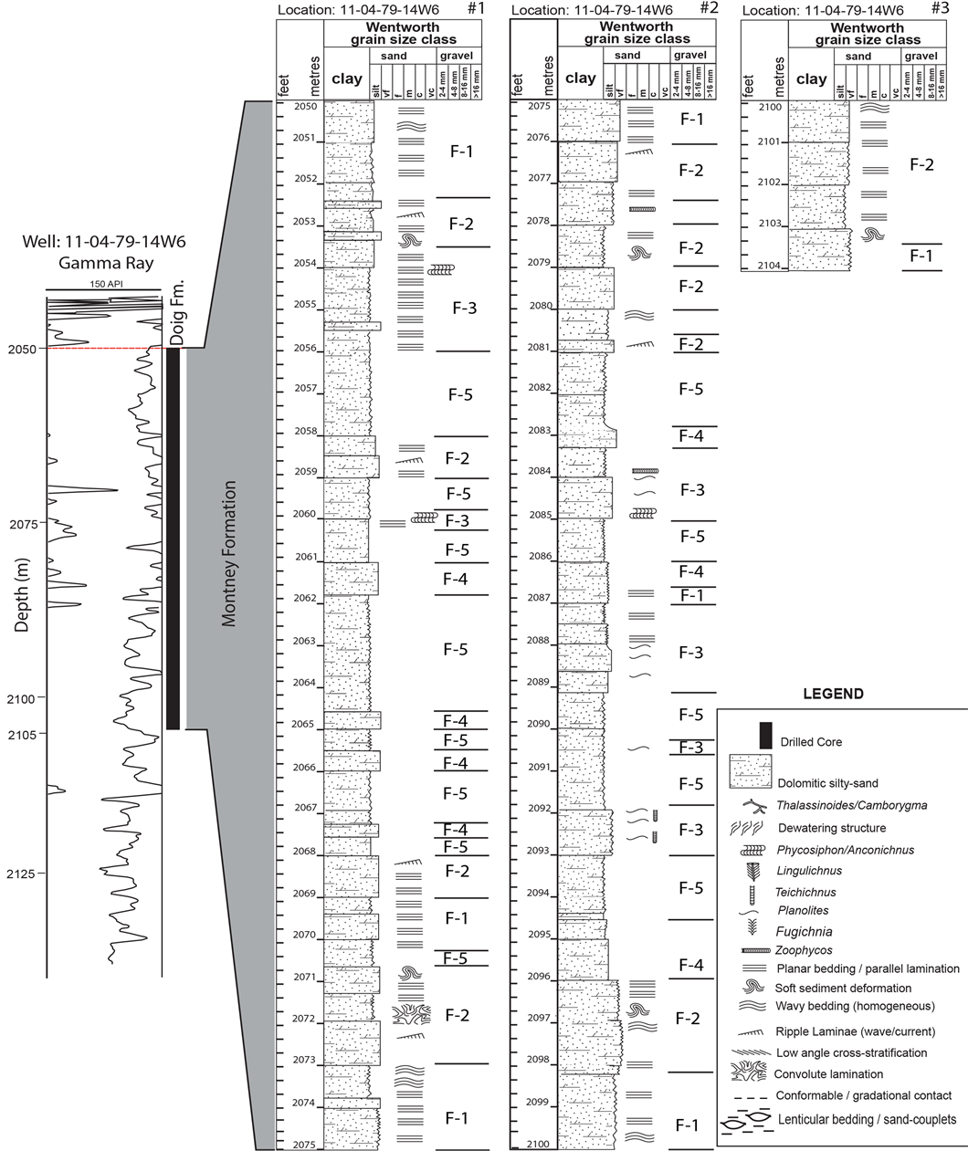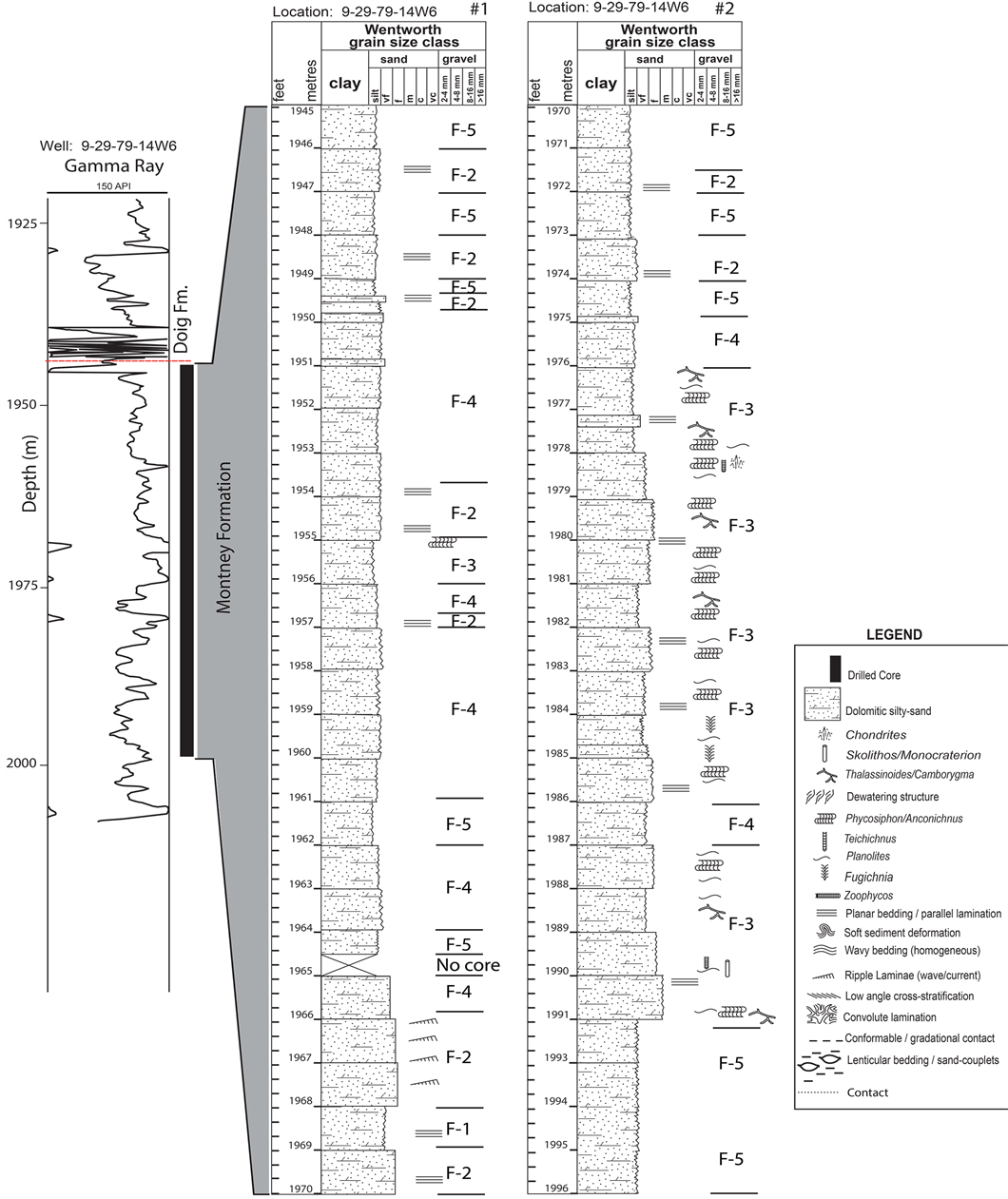 Based on sedimentological and ichnological criteria from examination of Montney Formation cores in the study area, five lithofacies associations were identified: Lithofacies F-1, Lithofacies F-2, Lithofacies F-3, Lithofacies F-4, and Lithofacies F-5. Detailed description and interpretation are presented below. Sedimentological and ichnological parameters were integrated in the interpretation of depositional environments for the Upper Montney Formation. Trace fossils recorded in this study from cores are described in detail in Table 1. The small-scale lithofacies scheme developed herein (F1 through F5) help to associate genetically related facies, which were interpreted cogenetically. A summary of the sedimentary facies scheme used in this study is shown in Table 2. Specific interpretations for the depositional environments for the facies were