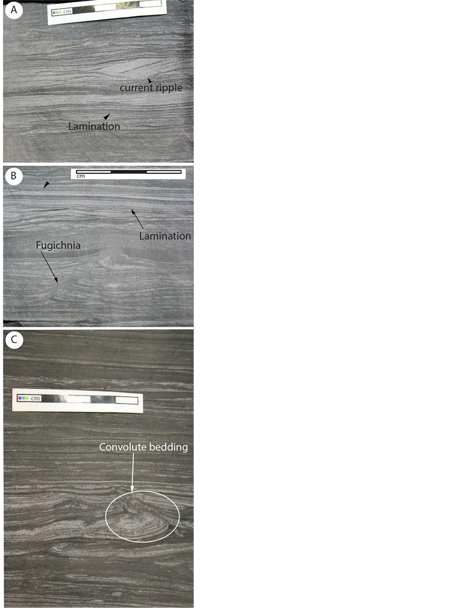 Convolute bedding [101] , and convolute lamination [123] [124] in Lithofacies F-2 are associated with fluid escape, and their formation is related to grain-size and deformation mechanism. The convolute lamination/bedding structures involve folding of lamination into cuspate upright form with a sharp anticline and a relatively gentle syncline (Figure 14(C)), and they are formed as a result of plastic deformation of partially liquefied sediment usually occurring shortly after deposition [108] . Convolute lamination may also be the product of seismically triggered event that results in rapid deposition. The present of soft sediment deformation and convolute lamination in Lithofacies F-2 (Figure 14(C); Figure 16(C)) are evidence of penecontemporaneous event, or small-scale local episodic deposition.
