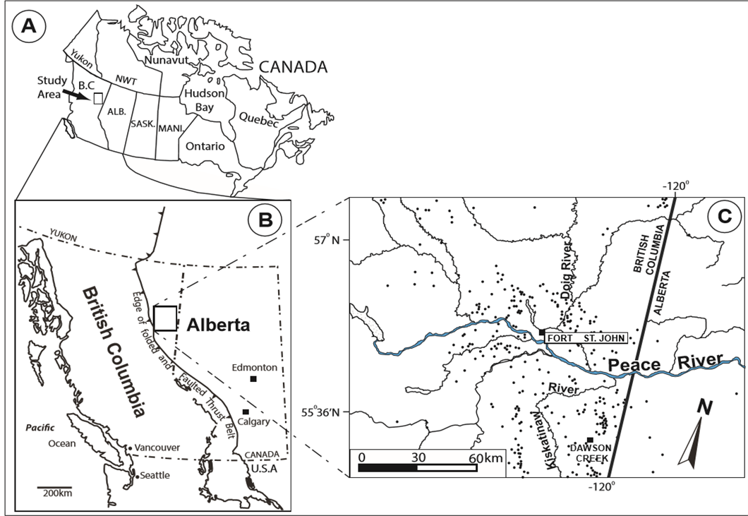 Figure 1. (A) Map of Canada showing provinces; (B) shows tectonic deformation and structure in Western Canada Sedimentary Basin [14] ; (C) shows location map of study area in northeastern British Columbia. The black dots represent drilled wells.