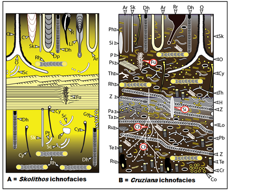 Figure 20. Archetypal expression of the Skolithos ichnofacies and Cruziana ichnofacies; modified from [34] . The diversity and abundances of trace fossils suite represented in this model is farfetched from the reality of the trace fossils observed in the study core interval of the Montney Formation (see Table 1. for trace fossils recorded in the Montney Formation in this study). This model serves the generality of the typical Skolithos ichnofacies and the Cruziana ichnofacies that may exist in any locality. However, a departure from this may occur when dealing with mixed Skolithos and Cruziana ichnofacies, in which cut crossing ichnofacies of opportunistic association dominates. The Skolithos ichnofacies interpretation of abbreviation in Figure A: Ophiomorpha (O), Conichnus (C), Skolithos (Sk), Diplocraterion habichi (Dh), Roselia (R), Lingulichnus (Li), Arenicolites (Ar), Rhizocorrallium (Rh), Schaucylindrichnus (Sc), Fugichnia (Fu), Cylindrichnus (Cy), Bergaueria (Be), Gyrolithes (Gy), and Palaeophycus tubularis (Pt). For the Cruziana ichnofacies, the interpretation of abbreviations for Figure B are: Arenicolites (Ar), Skolithos (Sk), Diplocraterion habichi (Dh), Rhizocorrallium (Rh), Ophiomorpha (O), Phycosiphon (Ph), Siphonichnus (Si), Planolites (P), Psammichnites (Ps), Thalassinoides (Th), Rhizocorrallium (Rh), Zoophycos (Z), Palaeophycus heberti (Pa), Rusophycus (Ru), Teichichnus (Te), Rosselia socialis (Rs), Conichnus (C), Cruziana (Cr), Phoebichnus (Pb), Lockeia (Lo), Helminthopsis (H), Fugichnia (Fu), Chondrites (Ch), and Cylindrichnus (Cy).