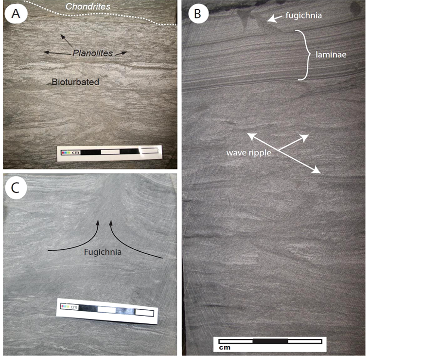 Figure 23. Shows depositional characteristics of Lithofacies F-3. (A) Shows bioturbated Lithofacies F-3 by Planolites and Chondrites (well: d-21-G/93-P-9; depth: 2534 m); (B) shows wave ripple, and lamination (well: 9-29-79-14W6; depth: 1967 m); (C) shows fugichnia, “escape trace” formed as a result of infauna attempt to escape burial during high, episodic sedimentation (well: 9-29-79-14W6; depth: 1984 m).