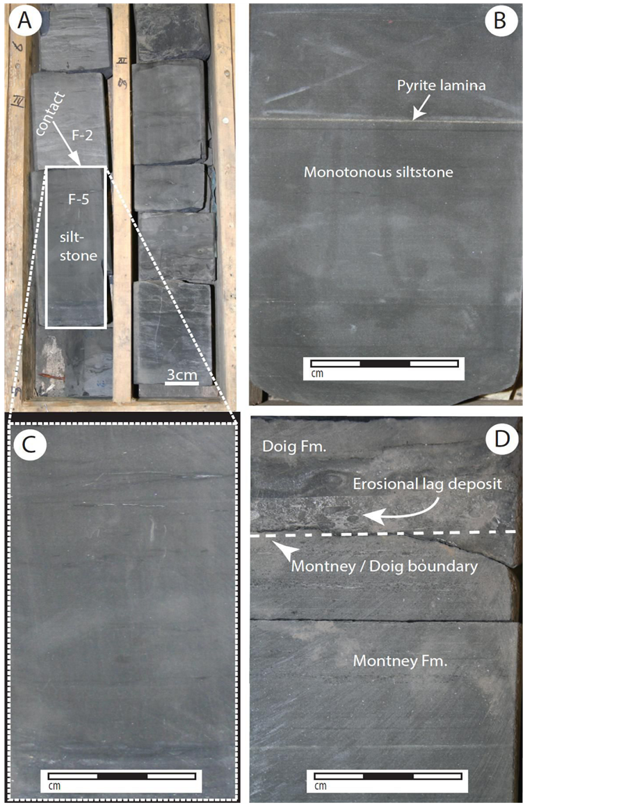 Figure 3. Logged core (well: d-39-F/93-P-9) showing lithofacies of the Montney Formation, and the overlying erosional contact of Glossifungaties - Trypanites surface demarcating the overlying Doig Formation from the Montney Formation in the subsurface of northeastern British Columbia.