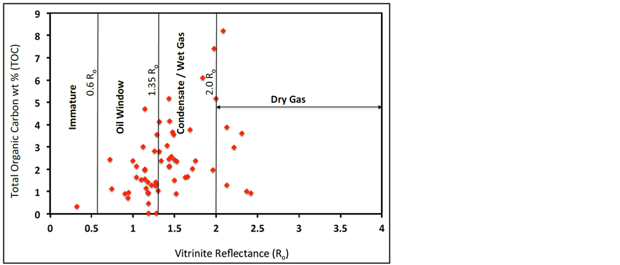 The dark color organic rich content (~2 wt% TOC) of Lithofacies F-1 is related to high nutrient rich sediment source and rapid sedimentation, which enhanced the preservation of organic matter [47] in oxygen-poor depositional environment [47] - [55] , where density or temperature stratified water column form, typically below wave-base [47] . Oxygen poor environments can be characteristic of a distal offshore setting [51] [53] [54] . The organic matter and high TOC of Lithofacies F-1 is associated with the clay mineral. [56] study the relationship between organic matter and shale in modern sediments and found that adsorption of carbon compounds onto clay mineral surfaces played a fundamental role in the burial and preservation of total organic carbon in the sediment. Organic matter is an economically important source of hydrocarbons, minerals, and metals [56] . Organic carbon is derived mostly from photosynthesis by plants and algae, which are atoms of carbon buried in sediments [57] . Lithofacies F-1 is mainly composed of coarse silt-sized grains. Silt and very fine-grained sediment is the product of weathering, and subsequently transported by fluvial or aeolian mechanisms. [58] used depositional model (Figure 12) to show sediment source and various ways of sediments transport to environment of deposition. Particularly, [58] shows that the deposition of silt and very fine-grained sediments are related to mobilization of fines across-shelf, or transported through processes, which may include sediments deposition from hyperpycnal plumes [59] [60] . As hyperpycnal flow gradually loses part of its suspended load progressively seaward, the finer-grained silt-sized particles are deposited in distal offshore environments [61] , where changes in bottom water anoxia and sediments settling from suspension mostly dominate [62] .
