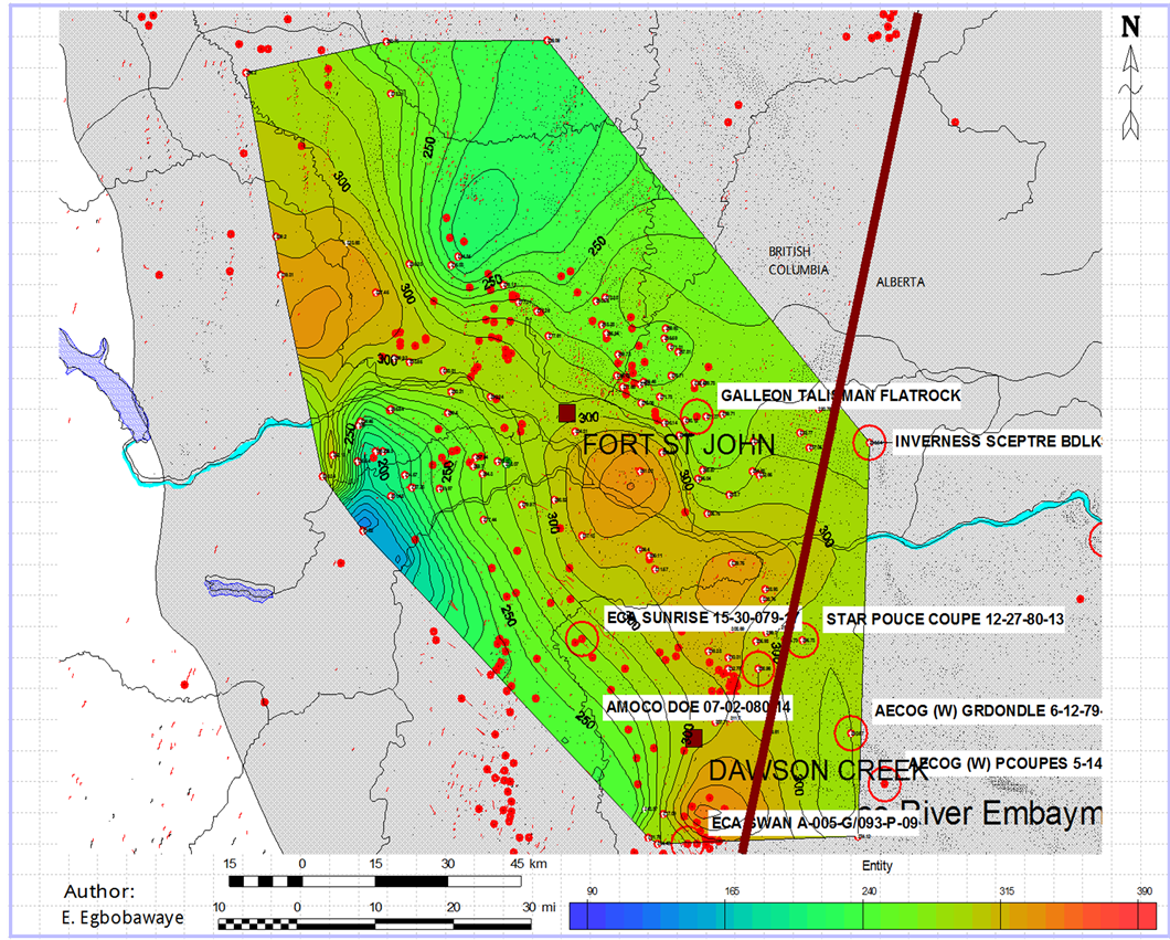 In Alberta and British Columbia, Triassic sediments were deposited in a central sub-basin known as the Peace River Embayment, which extended eastward from the Panthalassa western ocean onto the North American craton [1] . During the Triassic period, the Peace River Embayment was a low mini basin associated with minor fault block movement caused by a broad downwarp, which resulted in the rejuvenation of structural deformation within the Monias areas of southwest Fort St. John, British Columbia [1] [25] . Stratigraphically (Figure 5), the Triassic Montney Formation is Griesbachian to Spathian in age [21] . The Triassic succession thicken westward [1] , and rests unconformably in most areas, upon the Belloy Formation in outcrop of northeastern British Columbia; Carboniferous in parts of northeastern British Columbia and Alberta; and Fantasque Formation in outcrop at Williston [21] . The thickness of Triassic deposit is about 1200 meters in the western-most outcrop in the Rocky Mountain Foothills [26] . The thickness of the Montney Formation within the Fort St. John study area in the subsurface varies in the east along British Columbia/Alberta boarder boundary and to the western portion of British Columbia (Figure 6). The Montney Formation structure map (Figure 7) indicates higher paleostructure in the east and low in the western portion of the study area. The structural tilt shows a depositional thinning to the east and