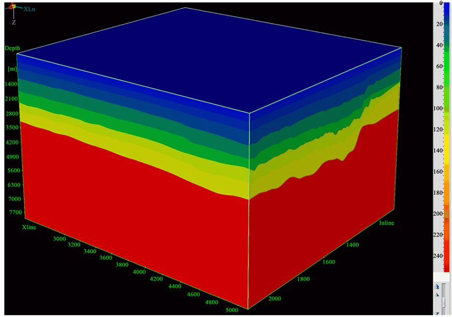 The selection for migration parameter plays a crucial role in RTM [7] . In the practical application, computational expense should be considered synthetically and treatment results should be optimized. In the situation of satisfying the processing demand, it’s crucial to reduce calculating costs as far as possible to shorten the consuming time of mass production [8] . The primary migration parameters include velocity model, imaging condition, migration aperture, forward wavelet, continuation step, frequency band and resection angle.