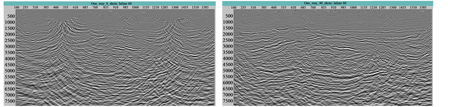 Migration aperture is the imaging space of underground information, and its size decides the seismic trace range of effective imaging points [11] . Migration aperture generally depends on the depth of purpose horizon, formation velocity and dip angle, and its area is in proportion to computing costs. Oversized and undersized migration aperture both prejudice imaging. The undersized migration aperture can insure imaging quality of simple structure and reduce computing costs, but cannot correctly image high steep structure; oversized migration aperture can obviously improve the imaging of high steep structure, but will lower integral continuity, reduce SNR and increase drastically calculating costs. Therefore, according to actual situation, migration aperture is determined by experiments [12] . In actual production, due to the too long elapsed time in RTM tests, this paper considers that migration aperture could be sure by pre-stack Kirchhoff depth migration. The migration aperture is chosen at 8000 m eventually.