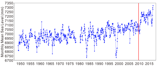 The tide-gauge of Pago Pago, American Samoa, is managed by NOAA/NOS [25] . The source of data is PSMSL [23] , station 539. It covers the period 1948-2016 with a completeness of 93% (Figure 9). Spanning 68 years, this record qualifies for analysis of sea level changes.