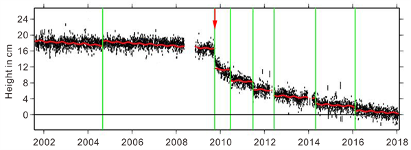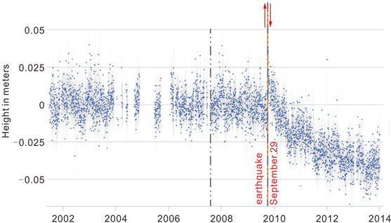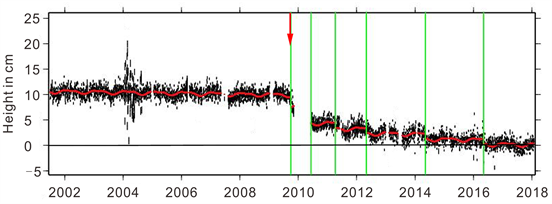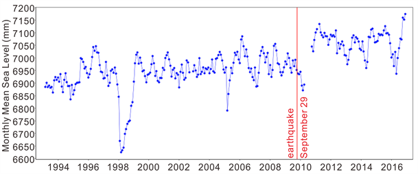 By comparison with the GPS records (Figure 6 and Figure 7), we can be sure that the signal in 2010 is caused by the 2009 earthquake, and has nothing to do with the ENSO-events recorded in 1998, 2005 and 2016.