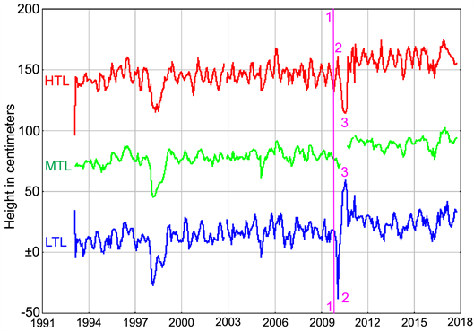 Figure 11. Complete tide-gauge record from Apia (SEAFRAME, 2018) with changes in high-tide level (HTL), mean-tide level (MTL) and low-tide level (LTL). Besides the crustal movements recorded in MTL (cf. Figure 10), there were significant changes in tidal range. (1) The earthquake strikes, (2) by mid-January 2010, the tidal range has increased by 65 cm, and (3) by mid-June 2010, it has decreased by 80 cm. The 1998 and 2005 signals are ENSO events.