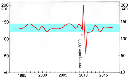 Figure 12 and Figure 13 graphs reveal that we―as a function of the 2009 earthquake―are dealing with a complicated interaction in crustal movements, gravitational compensation and sea level changes. This means that sea level analyses should be restricted to the pre-seismic period.
