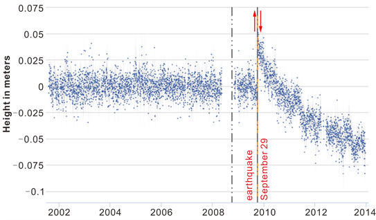 Right at the earthquake, the land levels jumps up by a few cm. This uplift is followed by a subsidence from a slowly relaxing crust, recorded by an exponentially decaying subsidence (continuing for, at least, a decade). This post-seismic subsidence is interpreted in terms of a viscoelastic response of the upper mantle [28] [29] .