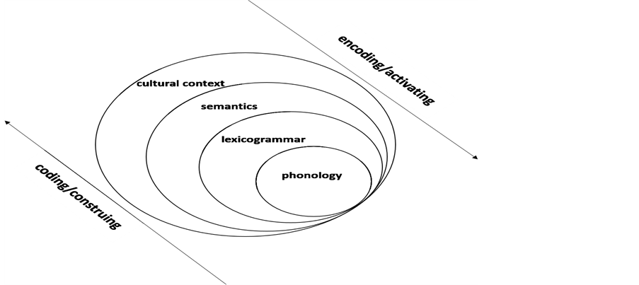 Nida (1998) points out that neither language nor culture can exist independent of each other, with the latter not only representing but also modeling the elements of the latter; and that the faster changing of culture than that of language makes it vital that the meaning of a word should be determined by both the syntagmatic contexts and the cultural contexts. In the view of Systemic Functional Linguistics, language can be theoretically divided into at least three strata (levels): semantics (meaning), lexicogrammar (wording) and phonology (sounding) and if the context is considered, together they form a four-stratumed model of abstraction, and the context being above the semantics. The relationship among these strata―the process of linking one level of organization with another―is realization: context is realized by semantics, and the realization of the semantics is realized by the realization of the lexicogrammar in phonology ( Halliday & Matthiessen, 2004, 2014 ). Hasan (2010) puts this relation in another way: from below to above (namely from phonology to context) it, the relation of construing or encoding, with phonology coding or construing the lexicogrammar, lexicogrammar coding or construing semantic and semantics coding or construing context; and the other way round, it is the relation of encoding or activating, with the stratum above encoding or activating the one below. Since context is subsumed into situation context and cultural context, we can say that cultural context is coded or construed by the construing or the coding of the semantics by the lexiogrammar (see Figure 1).