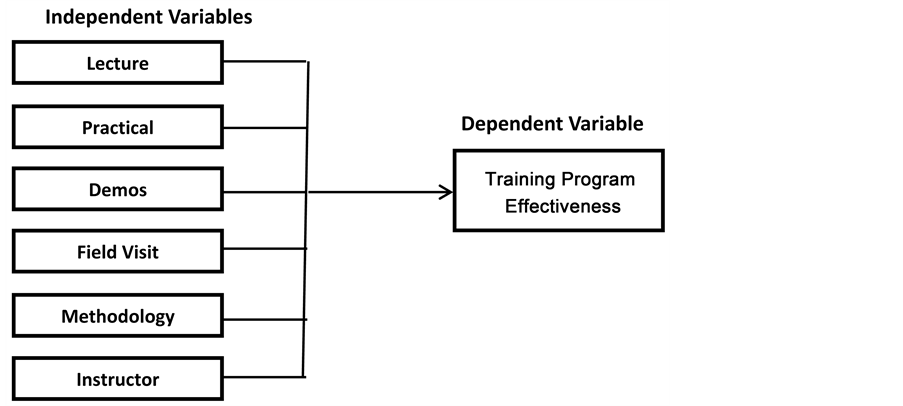 The dependent variable in this study is Effectiveness of training program and six independent variables used in this study are Lectures, Practical, Demos, Field Visit, Methodology and Instructor, (Figure 1).