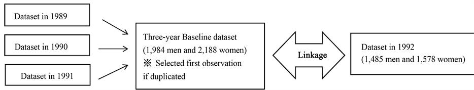 Figure 1 shows the explanation of baseline of 1989-1991 dataset for a linkage. In this study, the first three years (1989-1991) are considered as baseline with 4,172 (1,984 men and 2,188 women) to link the dataset in 1992 with 3,063 (1,485 men and 1,578 women). The number of matched observations in two datasets is 1,491 (727 men and 764 women) for three-year baseline dataset. Similarly, baseline of ten-year (1989-1999) is considered with 8,268 (3,939 men and 4,329 women) to link the dataset in 2000-2009 with 5,047 (2,343 men and 2,704 women) for a linkage. The number of matched observations in two datasets is 4,955 (2,310 men and 2,645 women). For each dataset, the first observation in ascending order of diagnosis date was selected as a subject of this present study if participants were duplicated.