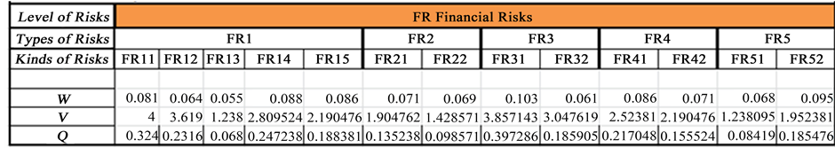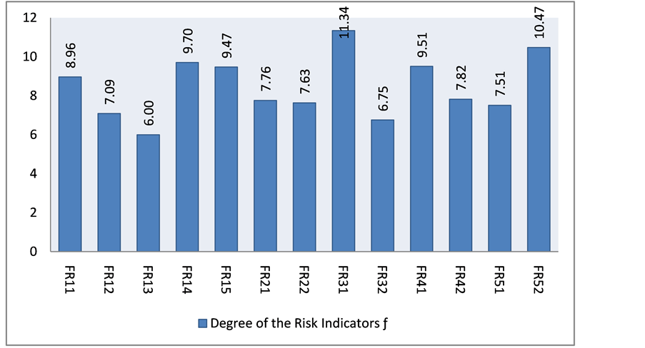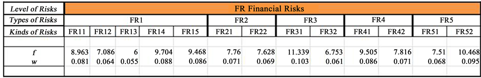 To calculate the risk degree importance, we have taken the same methodology shown to calculate risk attributes using RST theory in a process of factors decisional matrix and weighted average to calculate the risk values. Figure 6 shows the importance degree of risk indicators values (ω) for financial risk analysis. The normalized risk (ω) values are for the easier comparison and relate with other risk justification. Also from Figure 5, we may conclude the risk indicators values. In the financial policy (FR1), the energy risk (FR14 = 0.088) is the highest importance of degree in risk indicators because of the lack sufficient energy supply shortage. In the row of risk indicators, the monetary system (FR = 15) may affect the overseas companies in financial risk uncertainties. In the rest of the financial attributes, researches find as per the weighted average, liquidity risk (FR31 = 0.013) is the significant risk values in the company solvency and financial regulation (FR21 = 0.071) in the segment of internal policy of that industry. Overall, financial global uncertainties (FR51 = 0.068) has also the degree of importance in risk analysis.