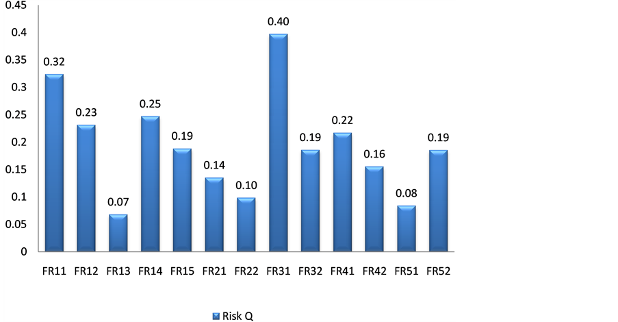 From Figure 9, we can describe the highest degree of risk attributes; (FR31 = 0.39) liquidity risk has the highest value which indicates the most degree of importance in terms of experts’ knowledge (Q). Then, the interest risk uncertainties (FR11 = 0.324) indicates the degree of importance in the Financial policy risk types segment. Among the other risk uncertainties, FR14 = 0.25 and FR41 = 0.22 has the significant degree of importance in the financial risk uncertainties.