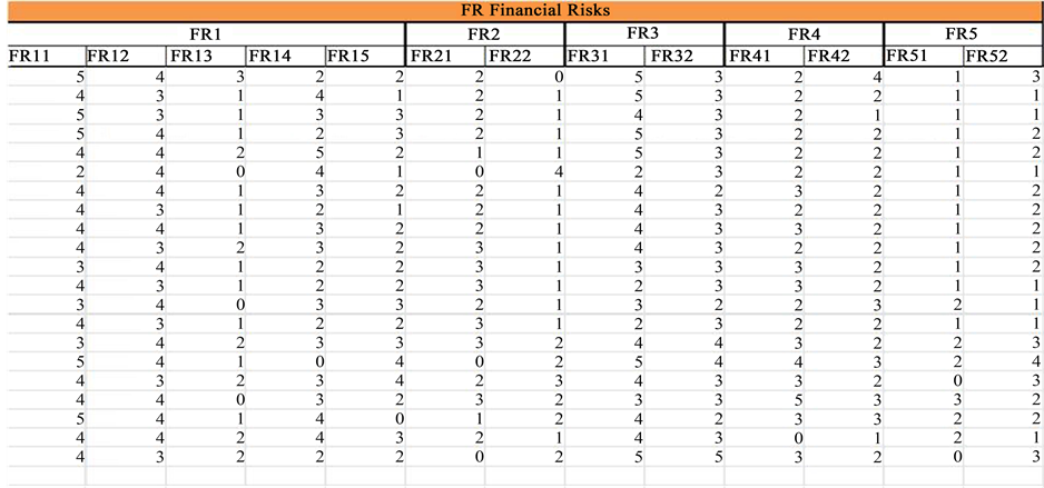 The second phase is arranging the data in matrix format. We already encoded the risk factors as attributes. Now we arrange the each attribute scores by each managerial rank people as a row of matrix. Figure 3 repre- sents the risk matrix of financial risks.